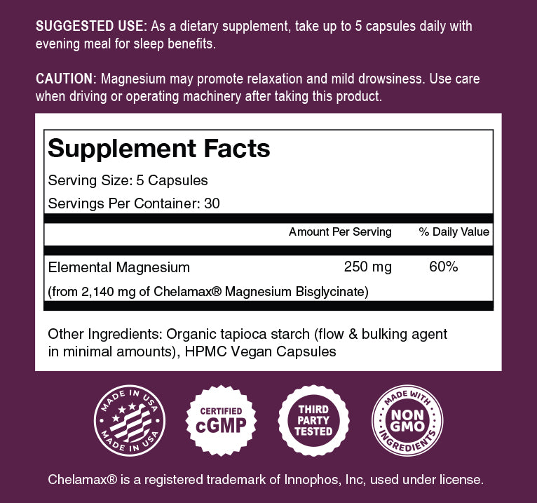 Our formula uses Chelamax® Magnesium Bisglycinate, a fully chelated form that’s highly absorbable and gentle on digestion. Many magnesium supplements use oxide or citrate forms that are poorly absorbed or harsh on the stomach.