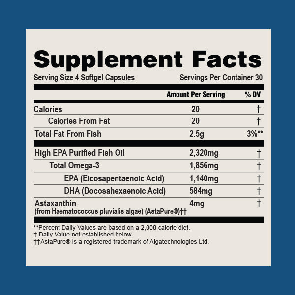 Each serving provides 1,140 mg EPA and 584 mg DHA. Each serving contains 1,856 mg total Omega-3."